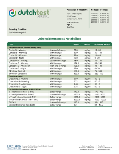 The DUTCH Adrenal Test is a comprehensive hormone test that evaluates adrenal hormone levels, cortisol patterns, and their metabolites using dried urine samples. This package includes the DUTCH Adrenal test kit, a 60-minute Deep Dive Health Consultation with Lab Review, and a personalized protocol with lifestyle, nutrition, exercise, and supplement recommendations.