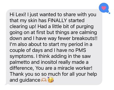 Working with her has been life-changing and I’m sooo excited to continue seeing improvements in my health! If you are struggling with acne, hormone imbalances, gut health issues, or any other “random” symptom, Lexi is your girl!