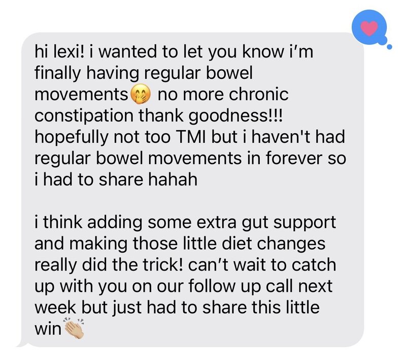 Lexi was a breath of fresh air! She helped me get to the root of what was actually going on and for the first time in forever I feel GOOD after eating. No more constant discomfort or playing guessing games with food. My bloating and digestion have significantly improved and I finally don’t feel like food is the enemy!