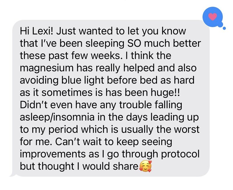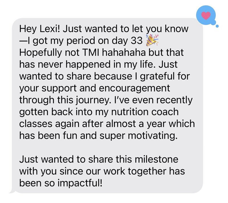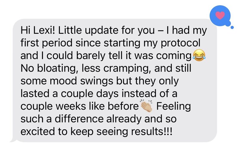 After working with her and doing functional lab testing, I’ve seen such a huge shift! My energy is so much better throughout the day, my PMS symptoms have practically disappeared, my digestion has improved, and I’m finally starting to see the scale move in the right direction. I’m so grateful for Lexi’s guidance, support, and knowledge. She helped me get my health back on track and I finally feel like myself again!!